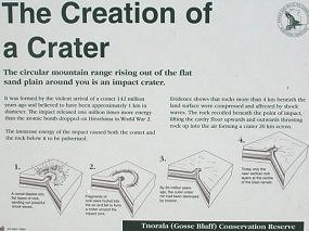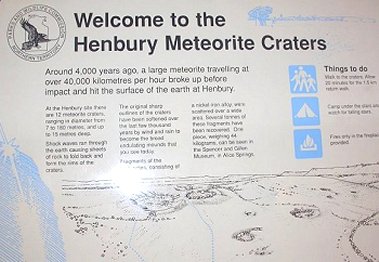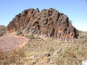 | Vor 4000 Jahren schlug hier ein Nickel-Eisen-Meteor ein. Bevor er aufschlug ist er explodiert, und es sind 12 Krater von 180 bis 7 m Durchmesser vorhanden. Einen 44kg schweren Klumpen davon kann man im Museum von Alice Springs sehen. Der rote Punkt am Bild zeigt zwei Leute(winzig). |